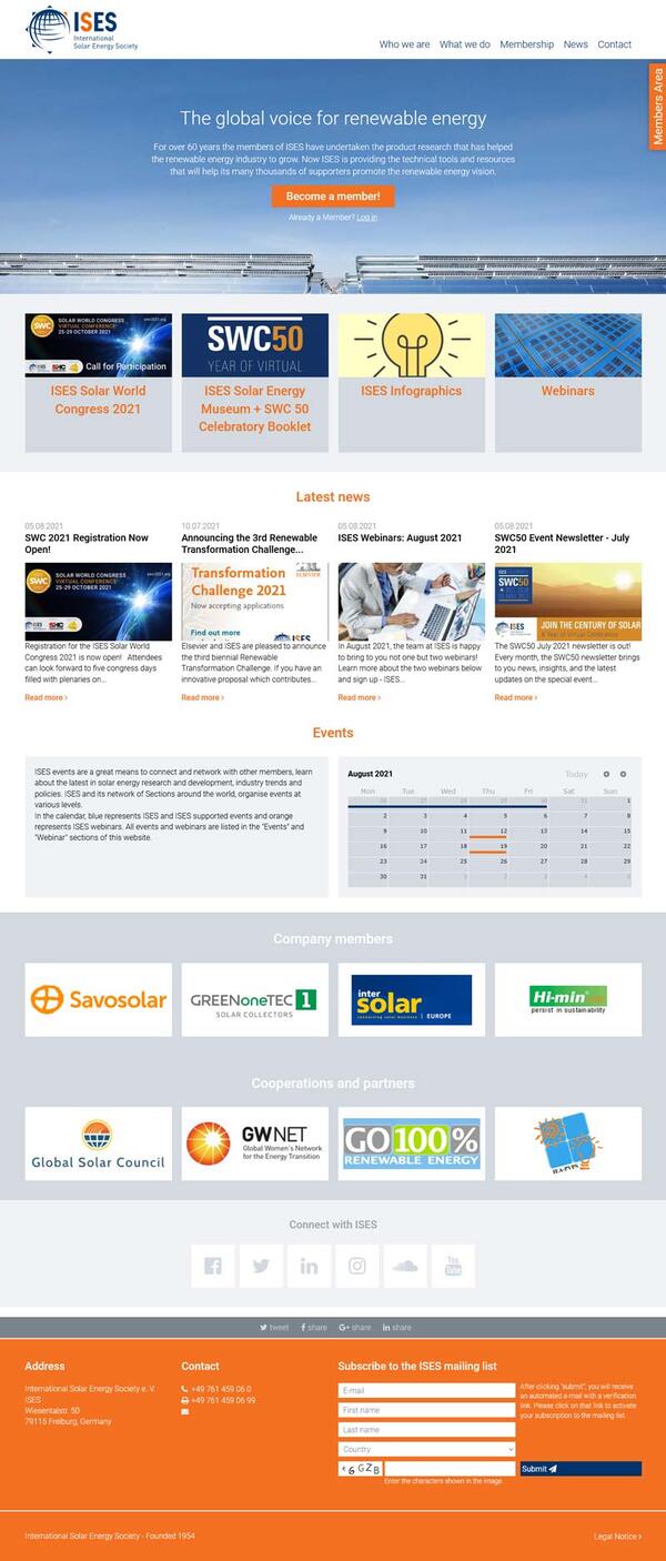ISES ist die größte internationale Solarenergiegesellschaft mit einer umfangreichen Mitgliedschaft weltweit. Seit über 60 Jahren betreiben die ISES-Mitglieder Produktforschungen, die zum Wachstum der Branche für erneuerbare Energien beitragen.