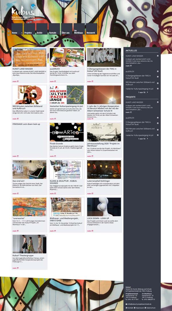Durch die Neugestaltung der Homepage der Kubus³ Projektwerkstatt e. V., ist es uns gelungen, dem Verein ein virtuelles Forum für seine Arbeit zu geben. Hier soll die Kunst im Vordergrund stehen. Mit einer stringenten Menüführung sowie einem klaren Seitenaufbau, informiert die Seite über den Verein, seine Arbeit und aktuelle Projekte. Equinoxe unterstützt den Verein mit dem Sponsoring dieser Homepage.